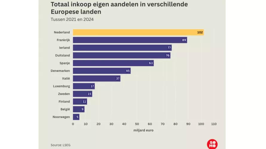 De onderschatting van het jaarlijkse verlies voor de schatkist door het CPB heeft volgens SOMO vier oorzaken. Het CPB onderschat de omvang het structurele karakter van deze fiscale sluiproute. Nederlandse bedrijven kochten in de periode 2021-2024 voor 102 miljard euro eigen aandelen in, meer dan Frankrijk en Duitsland.